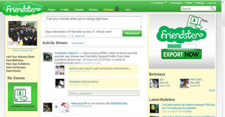 Λίγα χρόνια αργότερα, το 2002, εμφανίστηκε ο ιστότοπος Friendster. Όπως το Six Degrees, επέτρεψε στους χρήστες να εγγραφούν με τη διεύθυνση email τους, να κάνουν φίλους και να τους αποθηκεύσουν ως μέρος ενός προσωπικού δικτύου. Τα άτομα μπορούσαν να μοιράζονται βίντεο, φωτογραφίες και μηνύματα με άλλους χρήστες, όπως επίσης να αφήνουν σχόλια στα προφίλ άλλων ατόμων, εφόσον ήταν μέρος του προσωπικού δικτύου του άλλου. Μετά από μετατροπή το σε social gaming site το 2011, το 2015 ανέστειλε όλες τις υπηρεσίες της και την 1η Ιανουαρίου 2019 σταμάτησε οριστική τη λειτουργία του.